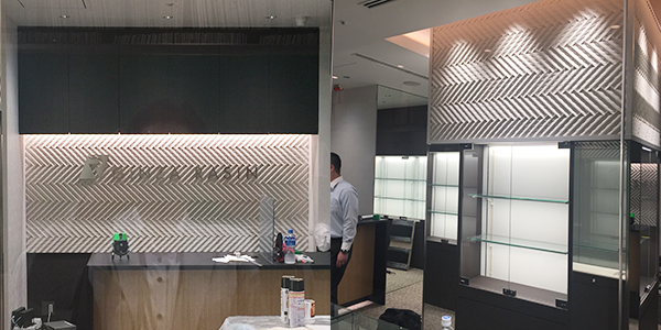 壁の表面には縄目模様をかたどった本物のタイルを使用し、ライティングによって重厚感と「和」らしさを演出しました。